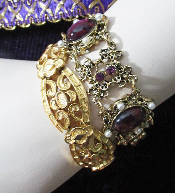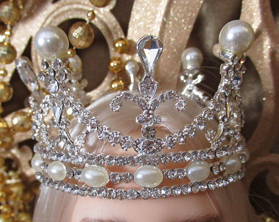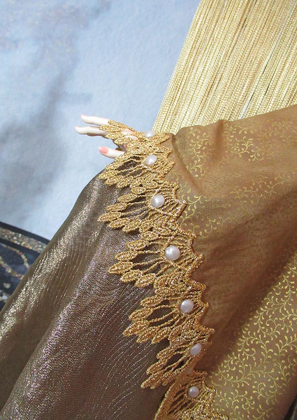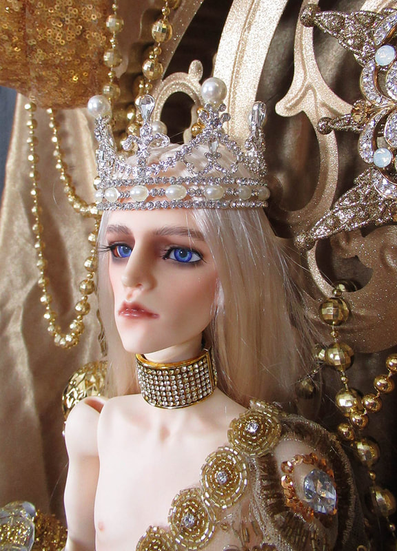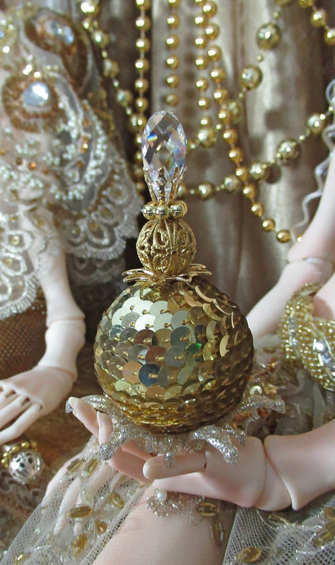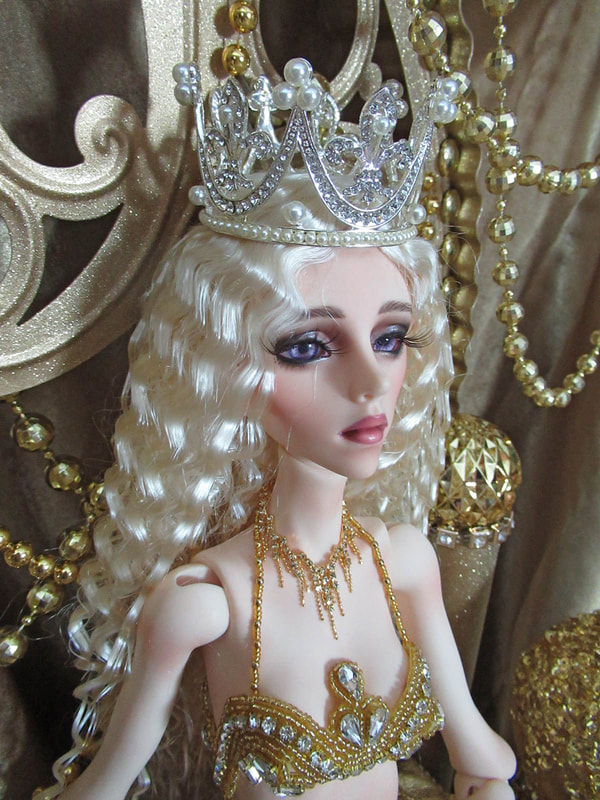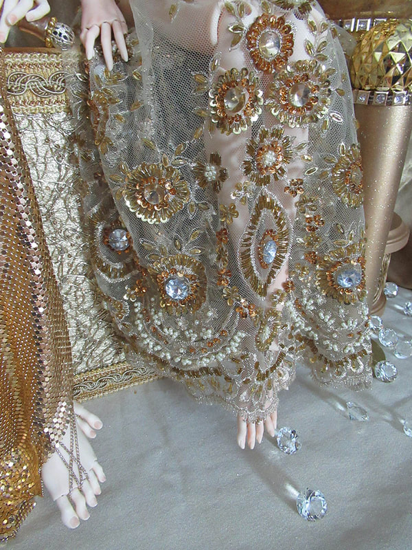 I wanted a scene that epitomized the show title and these two slightly odd Doll Chateau ball jointed dolls seemed right for the King and Queen of it all. They wear draped outfits of richly beaded fabrics. The King’s skirt is metal mesh, the Queen’s halter a bit of shaped trim.