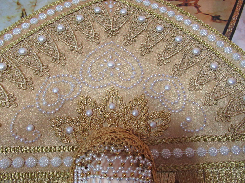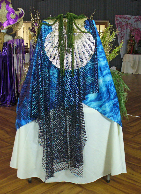 The purple satin gown has side drapes of embroidered netting called follow alongs. The black pedestal gown is made of satin, crinkled crepe, rhinestones trim and scrapbooking motifs. The center gold gown was fashioned after Erté with its huge kokoshnik headpiece, voluminous fabrics and fringe, though the crinkled column dress is more reminiscent of Fortuny’s designs. And of course, there had to be a cocoon coat which was constructed of a crushed velvet scarf and a lady’s tricot blouse from a thrift store and fake fur.