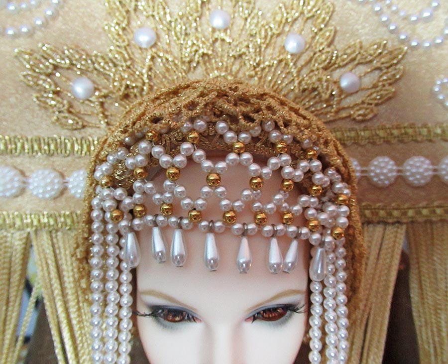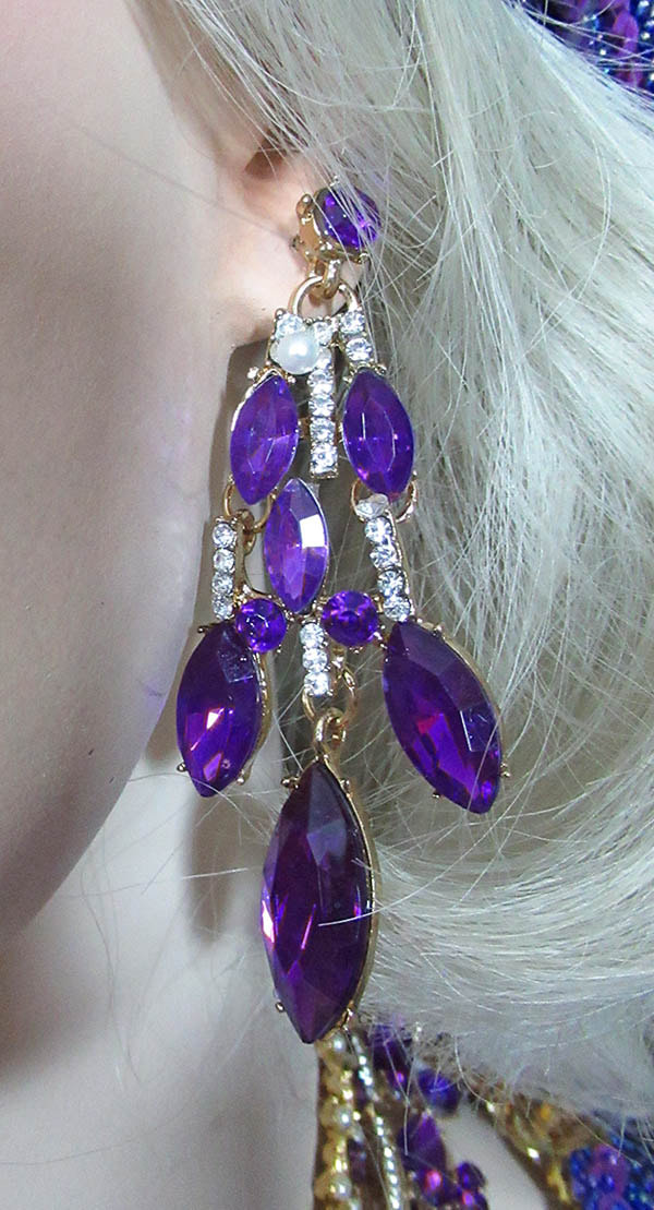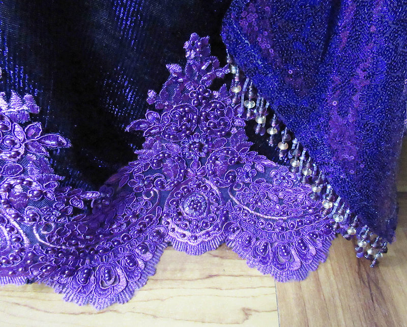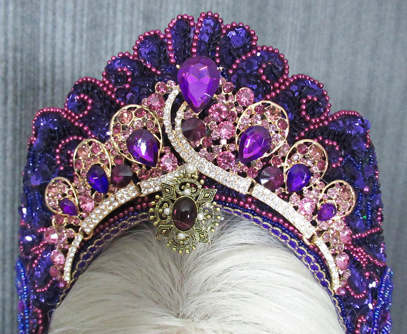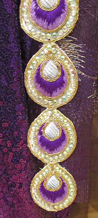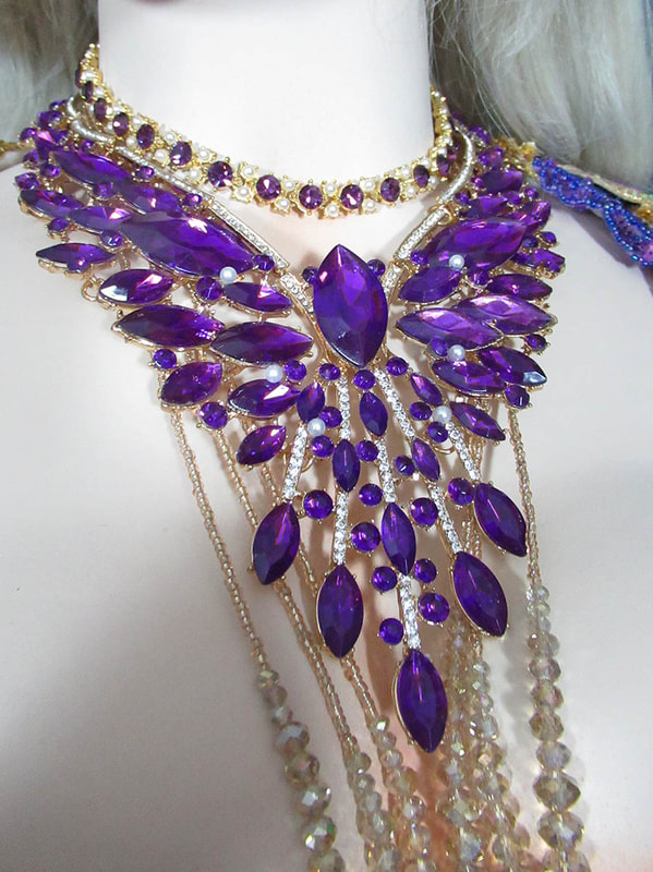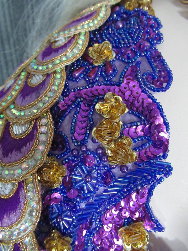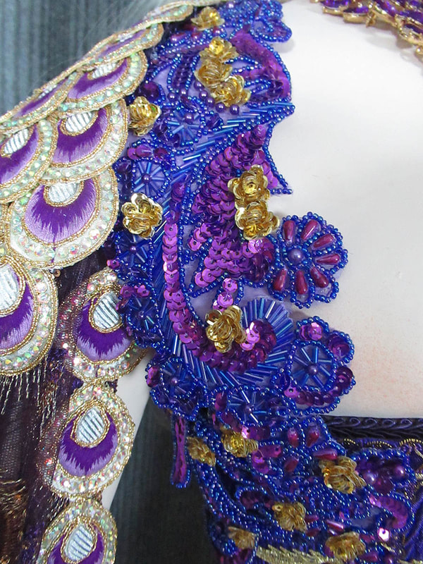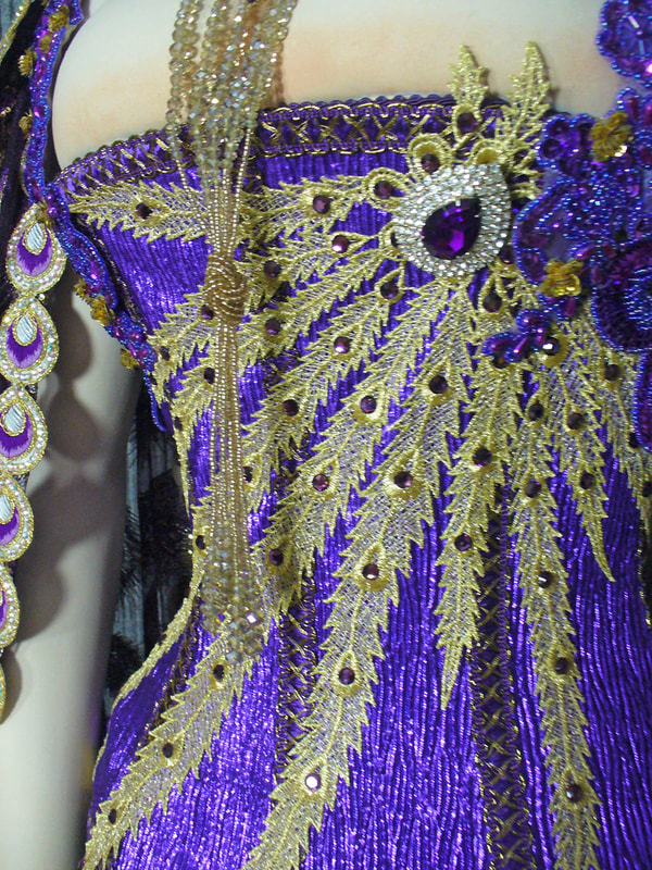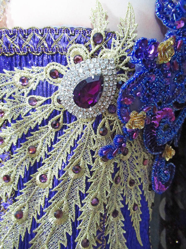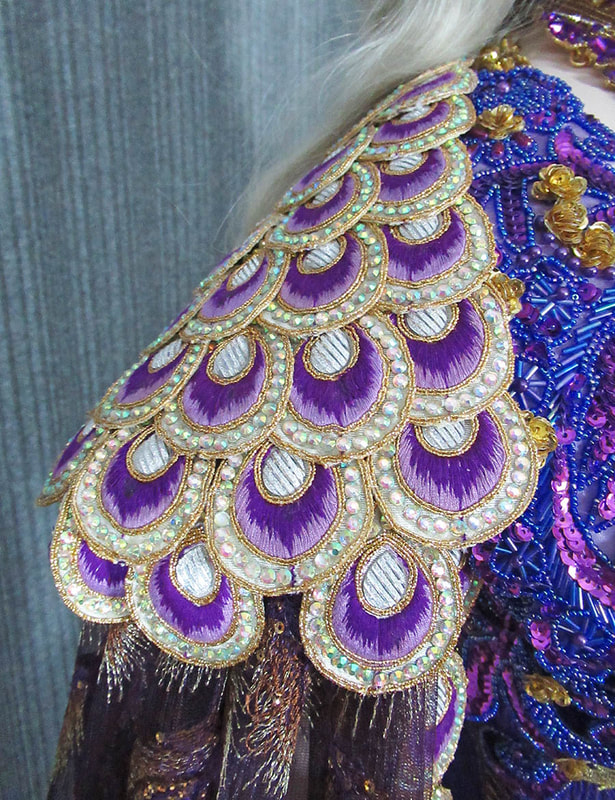 Dolly is a purple jewel dressed in peacock motifs from her headpiece to her capelet, flowing sleeves and corset. Her costume features textured satin, velvet, embroidered netting, rhinestones, beaded appliques, trims and lace.