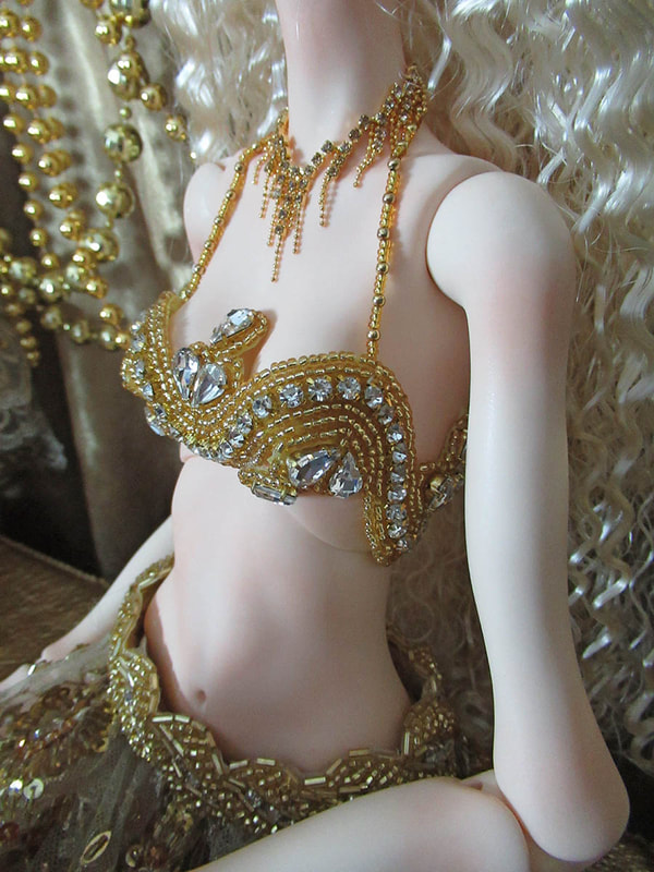 A simple halter and hip belt outfit of silver lace, pearls, beads and trims for the little mermaid. Her tiny baby hides in the gold coral next to her, and their pet sea dragon, a limited edition resin art doll from Europe, in the green seaweed.