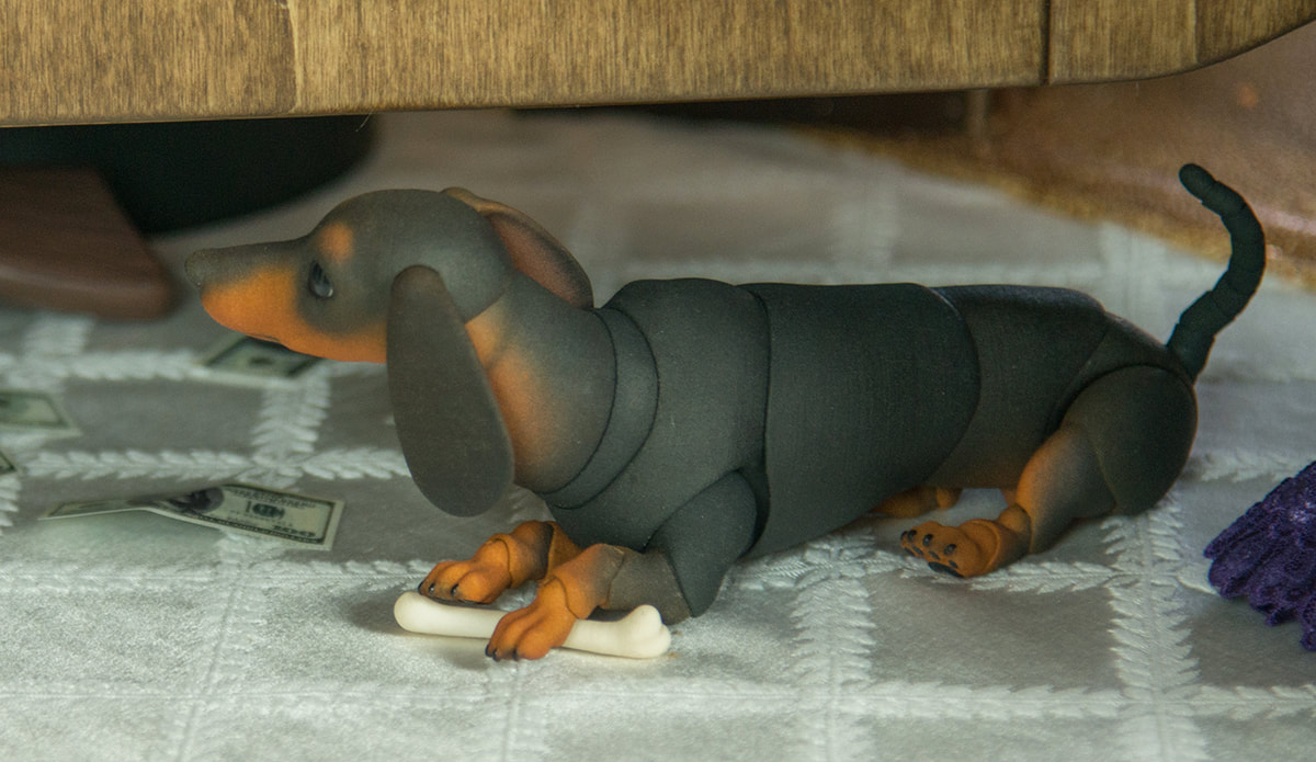 The furniture was commissioned from European artisans. Most of the set decorations—the Victrola, telephone, even a tommy gun—are from Asian doll suppliers. The 3-D printed dachshund under the fainting couch is more interested in guarding his bone than anything else.