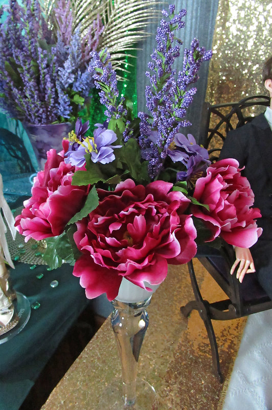 The House of Phinque, a 1920's fashion design studio. I have always loved the creations of Erté which is what inspired this group of costumes, which were all based on period garments. I shipped the male doll to Tea Tänav in Europe and she constructed the tailored tuxedo outfit. The lady in the gold sequin dress has marcelled hair made famous by singer Josephine Baker. The mauve lace and fringe dress is accented with a rope of pearls and a feather boa. The lady on the fainting couch in the hammered satin gown with huge pink flower accents has probably had too much to drink.