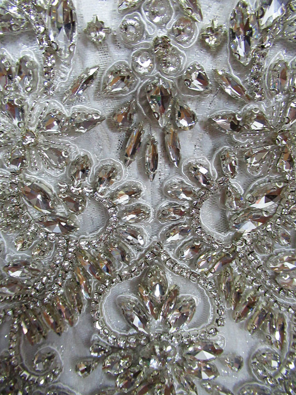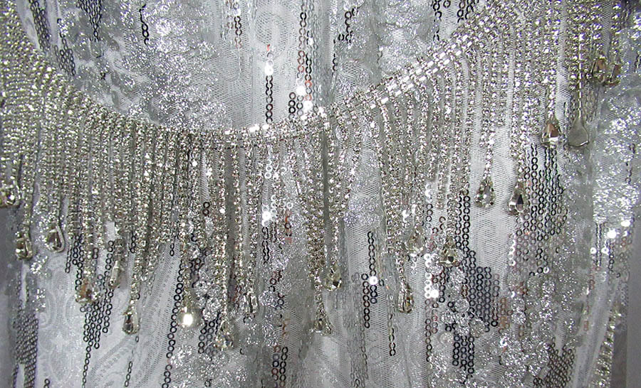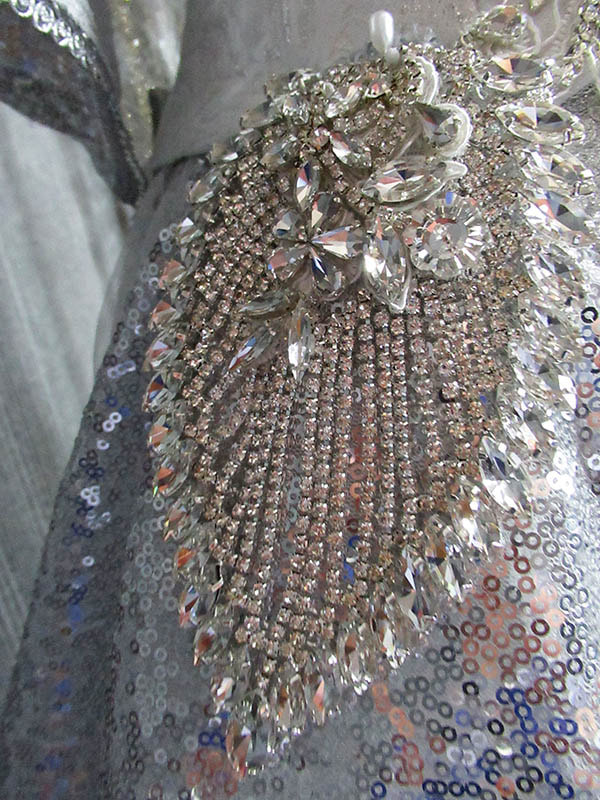 Josephine is a vision in glitz, wearing a corset embellished in crystals and a skirt of embroidered silver sequins draped over with dripping rhinestone trim. Her shoulder and hip drapes are sequin table runners. I commissioned her huge Swarovski rhinestone collar necklace from Fierce Drag Jewels in Rhode Island.